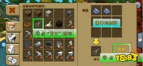 为什么树叶方块放不住?这边需要注意要让树叶方块挨着木头方块(原木、木板)才可以哦。剪刀的获取要先去地下挖铁矿,用熔炼炉烧成铁锭,然后在工具箱里合成。