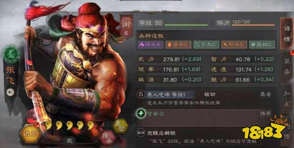 张飞的被动战法叫做燕人咆哮,效果是在战斗第二、第四回合对全体敌人造成兵刃伤害,如果目标为缴械状态则会额外让目标统率降低两个回合,如果自己是主将降低统率的效果也会对计穷状态生效哦。推荐学习战法有落凤、所向披靡、奋突,还可以换成轻勇飞燕、瞋目横矛等,大家根据自己的喜好来佩戴不同的战法就可以了,并没有什么明确的规定。