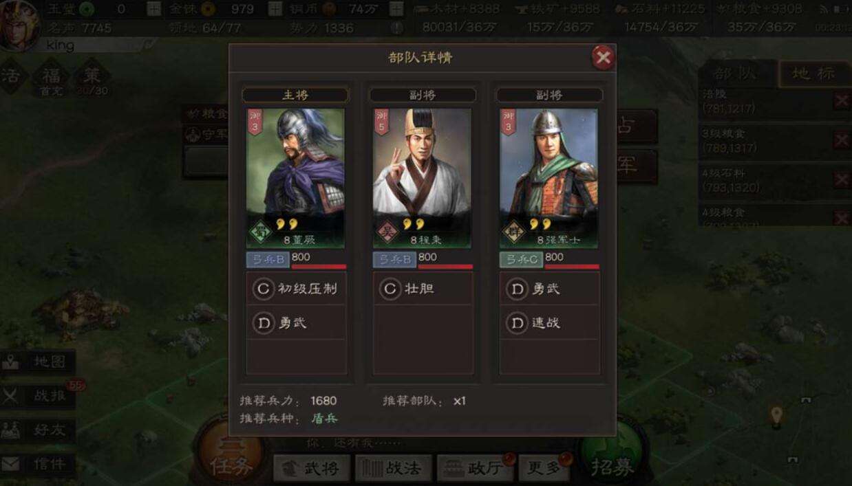 此时我们只需要点开资源地,查看一下资源地的兵力情况,调配一下武将,最好是拿上一个五星的就行,兵种适性也最好是相克制的最好,然后搭配好战法,就可以轻松的以少胜多拿下资源地,而且还不有太大的损失。