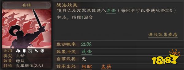兵锋是由张昭、孟获传承而来,可以使自己和友军单体进入连击状态持续1回合。在获得连击状态后便能发挥双倍的群攻效果。