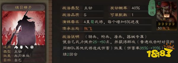 【瞋目横矛】可从武将张飞传承获得,战法可以为自己增加大量的武力属性,并且获得群攻效果,每一次普通攻击都能变成一次全体攻击,但是如果可以搭配连击便能激发出双倍的群攻效果。战法拥有40%的发动几率不算低,不过要注意除了弓兵兵种无法使用,其他兵种都可以随意配合使用。