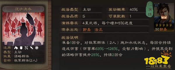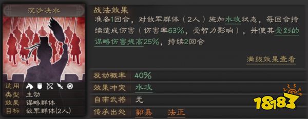 【沉沙决水】可从武将郭嘉、法正传承获得,战法可以造成不错的群体伤害,重点是使目标受到的谋略伤害提升,这会让后续发动的谋略输出战法打出更高的伤害。所以在配备战法的时候也需要注意武将速度和战法顺序问题。战法拥有40%的发动几率还算不错,而且没有任何兵种限制,可以随意配合使用。
