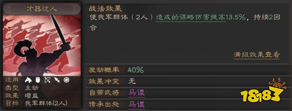 才器过人是由马谡传承而来,可以使我军2人造成的谋略伤害提高,配备给辅助后就能和沉沙决水制造出一加一减的巨大落差,收益远比单独使用要高。
