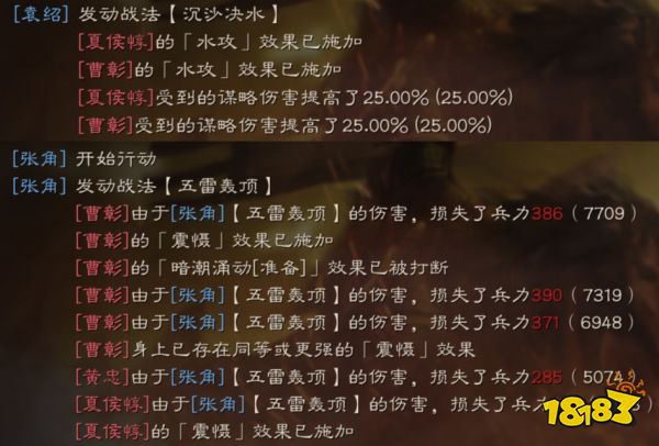 张角的自带战法【五雷轰顶】有着不错的输出,在敌军目标有水攻状态的情况下还能额外有几率使其陷入震慑状态。配备沉沙决水后,在战斗中轻易触发自带战法的额外效果。