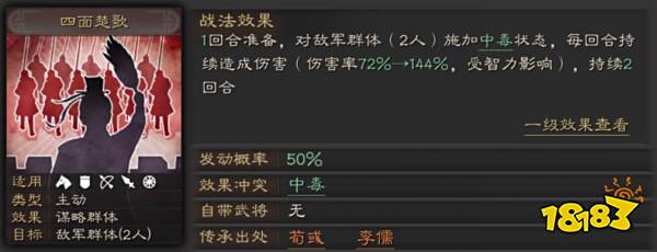 四面楚歌是由荀彧、李儒传承而来,拥有高额的发动几率并且能够施加中毒状态,持续造成伤害,是一个总伤非常高的谋略输出战法,配合沉沙决水就能够打出更高的伤害。