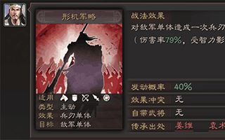 形机军略的效果是对敌人单体造成一次兵刃攻击(伤害率85%)和谋略攻击(伤害率79%受智力影响),发动率45%。如果没出错的话这个应该是大号的“屠几上肉”,各数据提升了百分之十。这与姜维的原本的被动战法义胆雄心来看要差的不是一星半点,因此如果大家不是很需要形机军略的话建议不要把姜维给传承了,毕竟姜维搭配文物双全会有很强的加成效果,越后期越强。