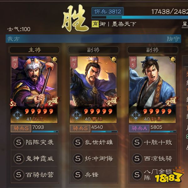 首先魏国郭嘉是最适合张辽的辅助武将,没有之一。十胜十败前两回合的洞察完美解决盛气凌敌的缴械效果,百分之50减伤是张辽输出的保障(武将伤害是按兵力来算的,兵力越多伤害越高),没有郭嘉不建议玩张辽。前面已经说过了张辽是可以作为单核输出的,曹操可为张辽提供30%的增伤,兵锋触发给到张辽,张辽直接起飞。折冲御侮保护张辽降对面双防没什么好说的,西凉铁骑是核心战法,以张辽的速度加上郭嘉前两回合的保护,前3回合张辽可以放肆输出直接秒杀对面主将,锋矢阵进一步增加张辽伤害,兵书推荐一鼓作气加胜战把爆发做到极致。