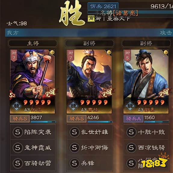 这里针对乐进简单说一下,乐进也是个输出武将所以不带锋矢阵,郭嘉速度比乐进快所以郭嘉带兵锋。