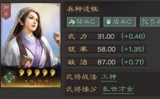 黄月英在属性上还是比较普通的,可以说没有太大的亮点,在五星武将里只能算是中规中矩,不过如今看到她只需要4御的话,那么在这类武将中就非常厉害了!当然了,由于黄月英的兵种基本都是C级,所以注定了她只能当工具人,不适合当输出类型的武将。