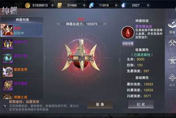 神器系统是独立养成的装备模块,在神器界面内,可进行神器的佩戴和更换,没有激活的神器显示激活和佩戴,已经激活的神器只显示可佩戴。神器收集属性在获得后立即生效,且不同神器之间可以叠加,神器的基础属性和技能只有装备后才会生效。