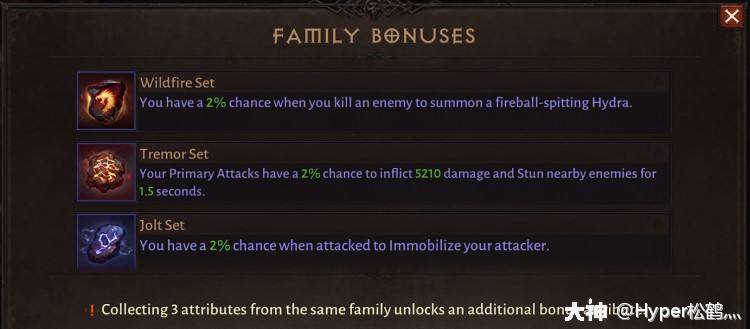 如果一件传奇装备的三条奖励属性来自同一个家族系,那么还会额外奖励一条固定属性。