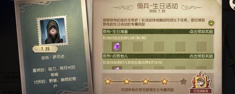 第五人格奈布生日是:七月二十三日就是奈布的生日。不少的学生玩家恰逢刚开始放暑假,使得他们有时间去打比赛做任务。四个奈布的求生者阵容相对来说比较罕见出现几率可谓是极小!