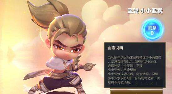 在神话英雄召唤界面,至臻小小亚索运气不好则是需要玩家将【剑意注满】才可以必出,经过计算保底价格在648RMB。