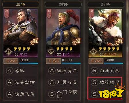 依旧是朱儁+张任+公孙瓒,朱儁刮骨疗毒和八门金锁阵、张任纵兵劫掠和轻勇飞燕,公孙瓒破阵摧坚和横扫千军,弓兵队。