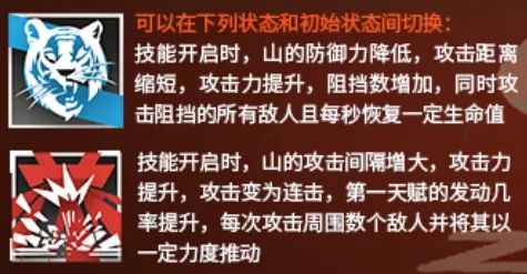 二技能是切换状态的技能,与银灰的二技能同理,几乎不需要什么技力就能启动。切换状态后,山降低防御,加攻击加阻挡并且同时攻击所有阻挡的敌人,同时还会持续回血。这个技能放在山的身上会有一个问题,那就是本身这类近卫的防御力就偏低,降低防御并增加阻挡数可能会增大其生存压力,但是同时以这种代价增加的攻击力或恢复力应该十分可观。