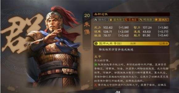 3、sp朱儁:战斗中,若敌军群体(2人)处于溃逃或叛逃状态时则压制敌军,使敌军造成的谋略伤害降低(该效果受智力影响且触发后每回合递减1/3),战斗第2回合,使敌军全体进入叛逃状态(受武力或智力最高一项影响,无视防御),持续2回合;自身为主将时,谋略伤害降低值有提升。