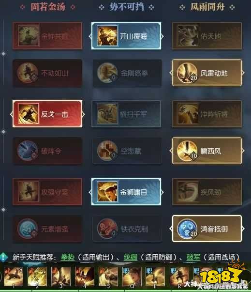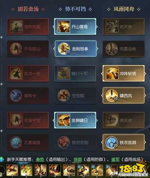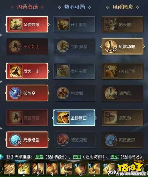 流派方面大家的技能带法基本一致,仅在天赋选择上稍有不同,首先是第二行有人点2金刚怒拳增加连招伤害以及怒气回复,有人点3风雷动地增加自己裂地一贯的瞬间爆发,其次是倒数第二行有人点2金狮啸日让狮吼释放时霸体,有人点3疾风劲增加释放解控后的免控时长与加速时间。