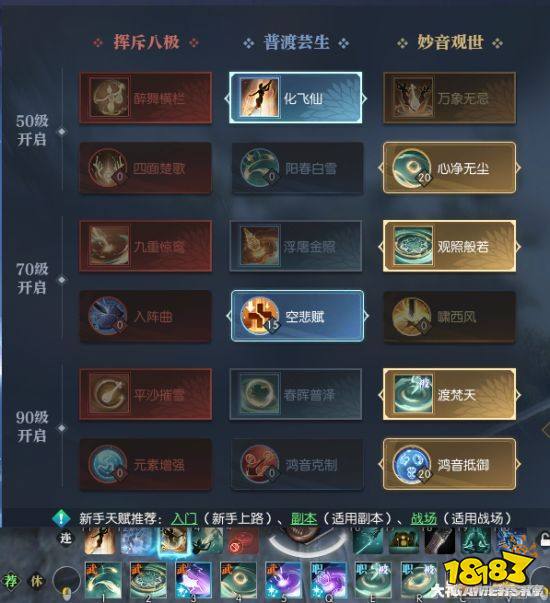 首先技能,飞花点翠步云霓梵音鹿双光环核心技能,九霄别人切你用来保命,自身状态好跳对方大团打控制伤害,塔同理,别人切你丢脚下,自身状态好丢对方大团打控制,浮光不要用来打伤害,浪费治疗时间,主要保命兜底霸体减伤加速。再是天赋,化飞仙上天回血回蓝霸体减伤。心净无尘观照般若,群体减伤群体免控拉满。剩下三个减疗、加强光环,抵御。