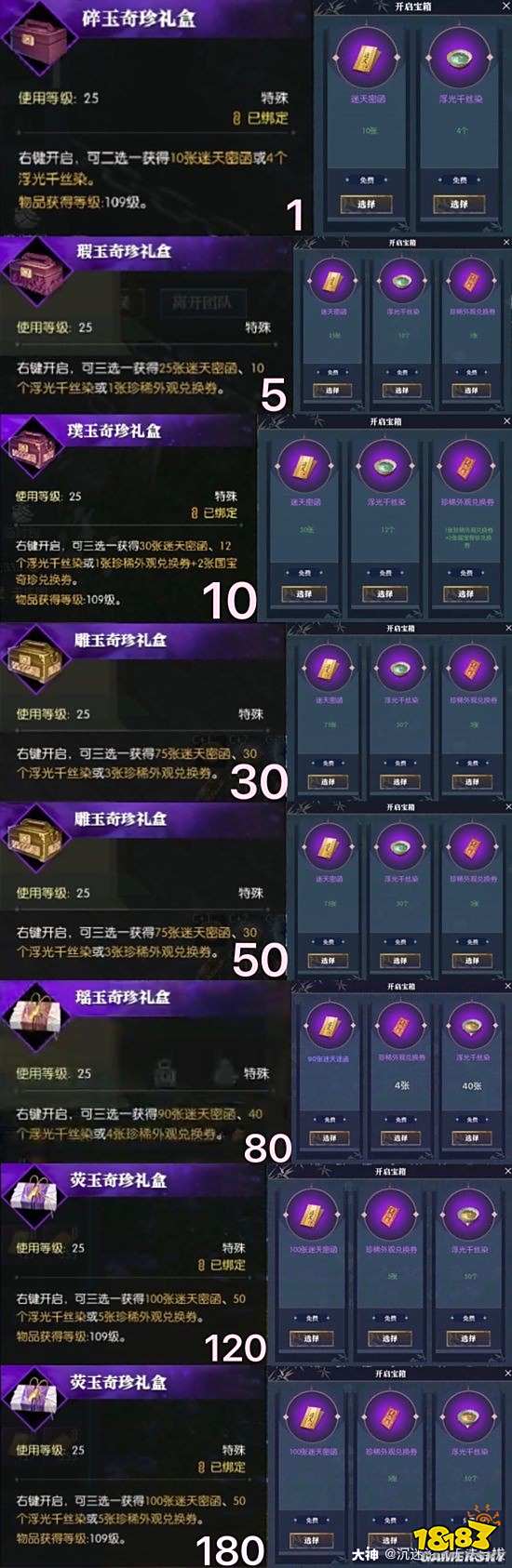 活动奖励2:抽奖次数礼盒(保底),第1/5/10/30/50/80/120/180次可获不同礼盒(迷天迷函/珍稀外观兑换卷/浮光千丝染)