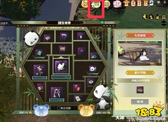 活动特色:180抽必得竹叶环身,280抽必得熊猫坐骑