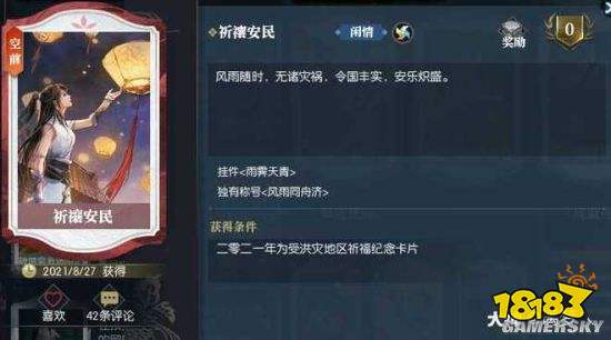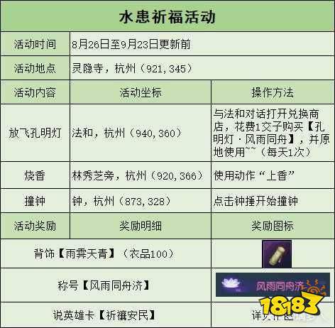 前往杭州灵隐寺为水患祈福即可获得专属称号风雨同舟济、腰饰雨霁天青及说英雄卡片!各位小可爱~白嫖的好机会可一定不要错过啊!