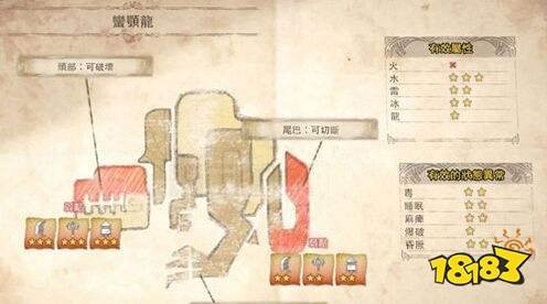 在《怪物猎人:世界》游戏中,蛮颚龙的弱点在于头部和尾巴两个部位,水属性的攻击对其效果最好,其次是雷属性和冰属性,而异常状态中除了爆破效果一般之外,其余几个异常状态的效果都是二星。