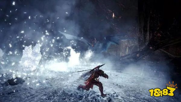 冰形态的煌黑龙,主要难点在于阻挡视野且无法被猎人破坏的冰柱,还有向近距离与中距离释放的弹道迷惑的冰锥。