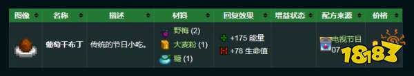 葡萄干布丁的配方需要1份野莓、1份大麦粉和1份糖。葡萄干布丁的作用是回复175点体力值和78点生命值。
