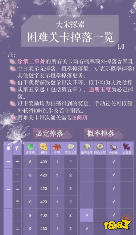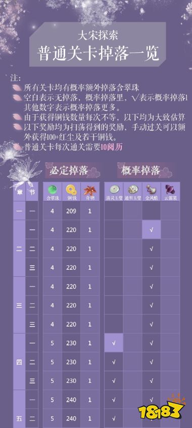 很多刚接触逆水寒中大宋探索玩法的玩家对机制还不是很了解,对关卡掉落物品也不清楚。这里给大家分享一个逆水寒大宋探索关卡掉落一览,详细的说明了各关卡掉落物品,希望可以帮到大家。