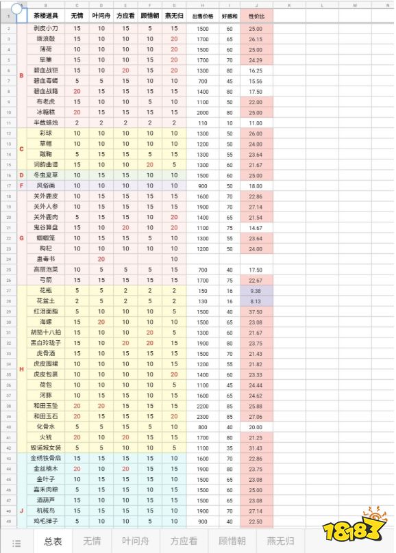 燕无归+24、叶问舟+24、无情+32、方侯爷+24、顾惜朝+16