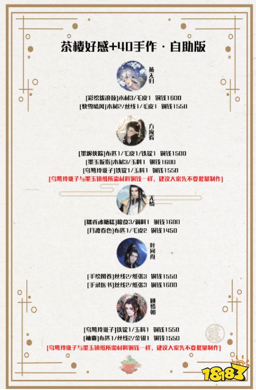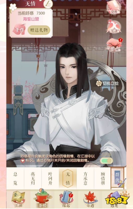 在茶楼的左上角,一开始送的礼物就是我们“捡破烂”(游历)来的礼物( ˘ω˘ ) ,等达到一定好感度后●▽●就只能送自己做的小礼物了~这个就是左上角的手作啦(ღˇ◡ˇღ)(达到好感度后,游戏会自动教你手作的事情(. ❛ ᴗ ❛.)各位才开始玩的夫人们,不用着急啦)这是个佛系游戏。