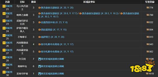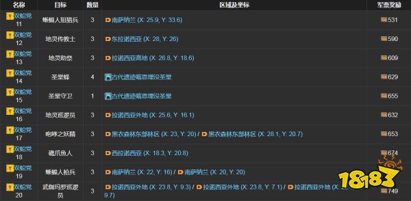 蜥蜴人投枪兵,东萨纳兰(X: 19, Y: 27);诘问小魔精,魔兽领域日影地修炼所;大镰螳螂,魔兽领域日影地修炼所;斗技场巨蚺,魔兽领域日影地修炼所。