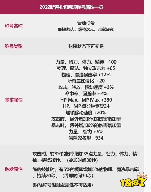DNF2022新春称号自选礼盒可以开出时空旅人、纵横次元、时空游侠。和去年相比,称号属性得到了升级,从15%词条提升到18%词条,不仅词条分布更加均匀,而且数值上也得到了增加。