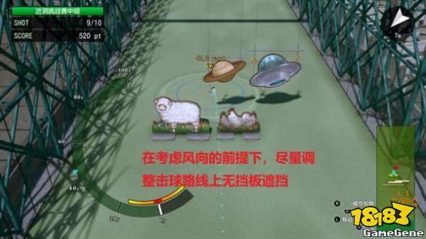 就拿上图举例,在不被挡板挡住的情况下,当然力度要刚好,击球位置正中的前提下,考虑是左下风向,我们要把目标移到球杆右上,如下图
