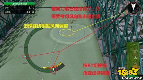 玩法如图,按R1变成俯视角,然后选择【力度】,根据【风向】,调整【击球位置】,或者调整【击球路线】。
