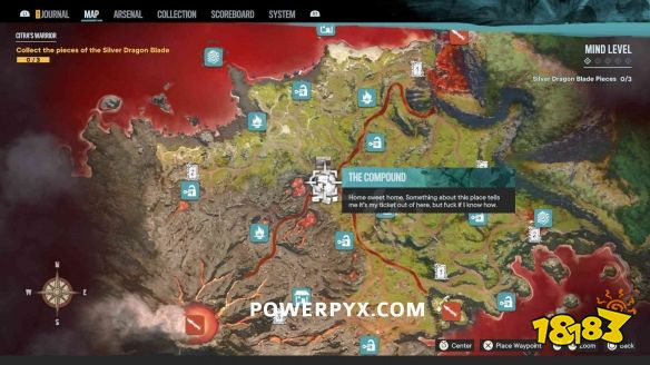 初始营地有一个地点,然后3个主线目标以橙色图标标记,16个支线活动以蓝色图标标记,靠近最后一个位置时会立刻跳杯。