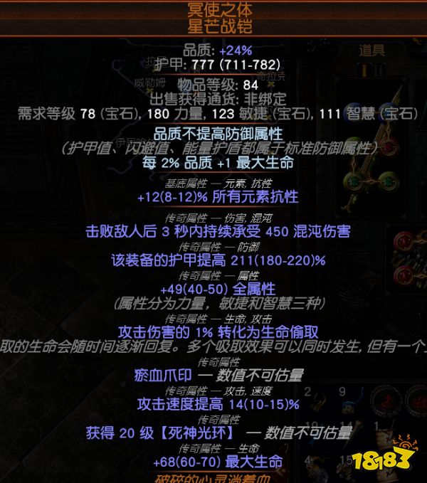 装备跟技能连接头:坚定、优雅、启蒙、怨毒 (这头省了两个天赋点,解密的自己看着办,优先力量跟抗性)