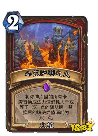 战士史诗法术,2费火焰,将你牌库里的所有卡牌替换成法力值消耗大于或等于(5)点的随从牌。替换后的牌法力值消耗为(5)点。