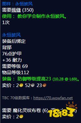 魔兽世界TBC怀旧服中,专业技能的上限提升了,新增了很多配方图纸,永恒披风配方世界掉落,可以开启密封的卷轴盒得到,密封的卷轴盒在祖阿曼可以买到。