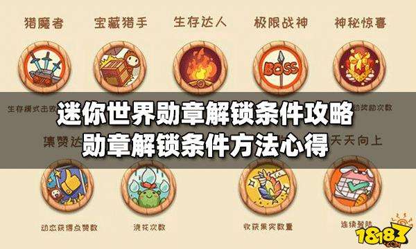 迷你世界勋章解锁条件心得是,通过积累生存模式获得,猎魔者,宝藏猎手,生存达人,极限战神,通过积累领取活动,神秘惊喜,通过积累创作热门,潮流最潮路,通过升级鉴赏家等级获得,鉴赏专家,通过积累好友数量,快乐小伙伴。