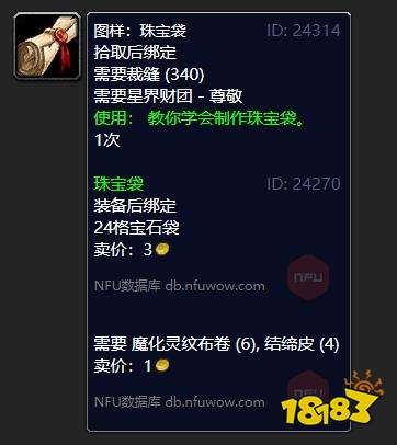 魔兽世界珠宝袋图纸是一个24格宝石袋,卖价是3金币,需要在裁缝340星界财团尊敬那里学,需要的制作材料是6个魔化灵纹布卷和4个结缔皮。