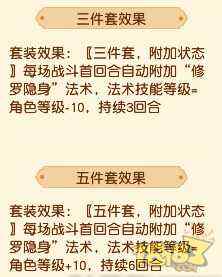 附加状态套装效果为佩戴3-5件相同套装效果的装备后,每场战斗首回合自动获得某种附加状态(需要消耗相对应魔法)。该套装能附带各种各样的效果,比较大众化,几乎所有门派都能用。
