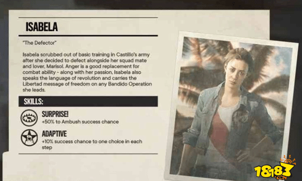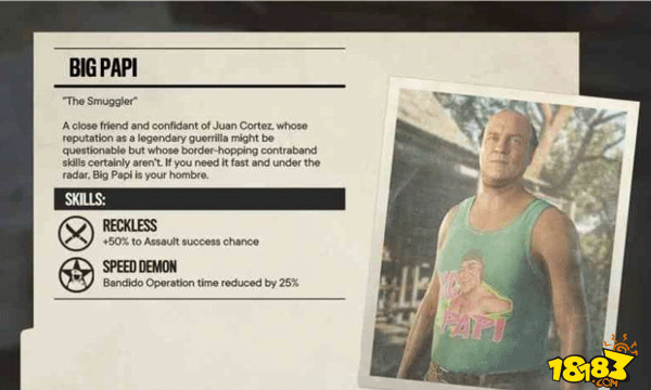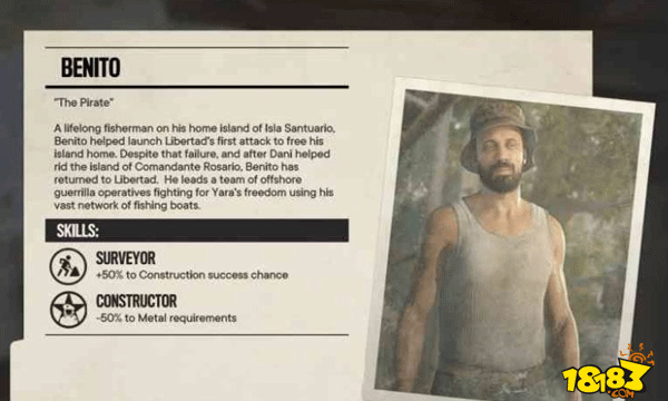 1、贝尼托,位置:起始领导者,在序幕 (Isla Santuario) 期间自动获得,在您到达第一个 Bandido 操作板时可用。技能:测量师 建造师