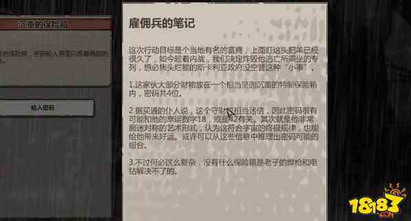 1、首先玩家通过雇佣兵的笔记可以获得密码关键的线索数字得知关键数字是18或者42。