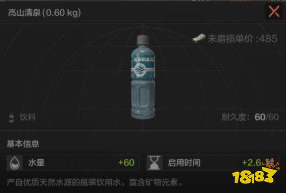 暗区突围口渴状态恢复方法介绍:进入暗区之前我都会携带饮品-青山高泉,这款饮品可以说是入门级的了,它的耐久度是60点,饮用后水量加60.启用时长是2.6秒。