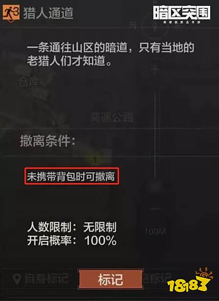 北部猎人通道撤离点属于特殊撤离点。虽然开启概率为100%,但如果选择猎人通道撤离点,我们则不能携带背包。