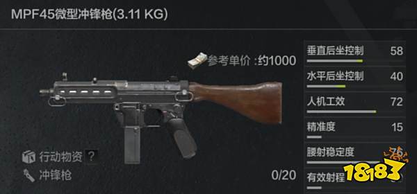 MPF45是一把使用.45口径子弹的入门级冲锋枪,后坐控制、精准度都比较低,不过76的腰射稳定度和700的射速还算不错。