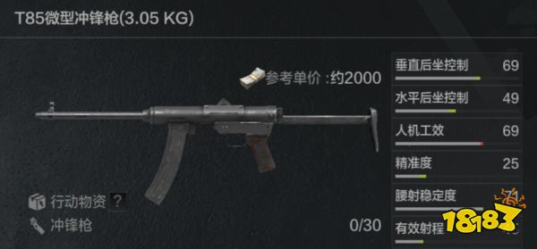 1、T82强度分析:T85是T79冲锋枪的升级版,同样使用7.62x25毫米口径子弹,属性相对有所提升,并保留了视野清晰的机瞄准星。