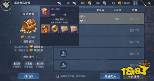 与商会成员组建商队在十五分钟内尽可能贸易五种系统制定物品达到高的贸易额,最终根据贸易额排名,系统会发放商队奖励以及商会排名奖励。奖励包括黄色船舱图纸、商贡、命运石、商会投资券等。