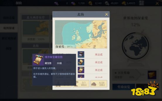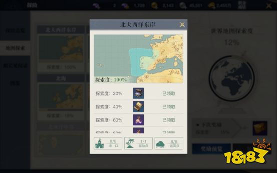 探索系统中可以领取大量地中海藏宝图,但是获取的过程较为漫长。我们每到达一个新港口、探索点及迷雾点后均可提升当前地图的探索度,每个地图累计探索度到达40%后都会奖励一张地中海藏宝图。我们可以在升级与探险的途中不断积累探索度,并领取丰富好礼。